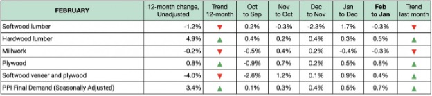 미국 노동 통계국(U.S. Bureau of Labor Statistics)에 따르면, 2026년 2월 침엽수 제재목 생산자 물가(PPI)는 0.3% 하락한 반면, 활엽수 제재목 생산자 물가(PPI)는 0.5% 상승하며 1월의 0.3% 상승세를 이어갔습니다. 목공 제품 생산자 물가(PPI)는 1월의 0.4% 하락에 이어, 2월에도 0.3% 하락했습니다. 합판 생산자 물가(PPI)는 1월에 0.5% 상승한 데 이어서 2월에도 0.8% 상승했습니다. 최종 수요 생산자 물가지수(PPI)는 1월 0.5% 상승에 이어 2월에는 0.7% 상승했는데, 이는 서비스 가격이 0.5%, 상품 가격이 1.1% 각각 상승한 데 따른 것입니다. 2월 최종 수요 물가 상승분의 절반 이상은 서비스 부문이 차지했습니다. 2026년 2월 최종 수요 생산자 물가의 조정 전 12개월 변동률은 3.4%였습니다.