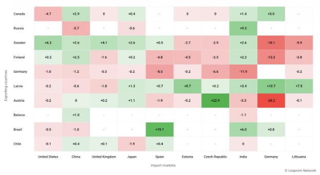 러시아는 중국 시장에서도 입지를 잃었습니다. 중국의 침엽수 제재목 수입 시장에서 러시아의 점유율은 전년 대비 5.7%포인트 하락한 반면, 캐나다는 2.9%포인트, 스웨덴은 2.6%포인트 점유율을 확대했습니다. 핀란드 또한 중국 시장에서의 점유율을 2.5%포인트 늘렸습니다. 중국의 수요 여건은 여전히 부진한 모습을 보였습니다. 국가 통계국 (National Bureau of Statistics) 데이터에 따르면, 2026년 2월 부동산 투자는 전년 동기 대비 10% 감소했으며, 상업용 주택 판매는 14%, 주택 신축은 23% 각각 감소했습니다. 스웨덴은 그 밖의 여러 주요 수입 시장에서 입지를 강화했습니다. 영국의 경우 점유율이 4.1포인트, 일본에서는 2.6포인트 상승했습니다. 전년 대비 변동 추이는 대체로 월별 추세와 일치합니다. 월간 데이터 또한 캐나다가 미국과 중국 시장에서의 점유율을 잃고 있는 반면, 다수의 유럽 공급업체들은 주요 시장 전반에 걸쳐 완만한 증가세를 기록했음을 보여줍니다.