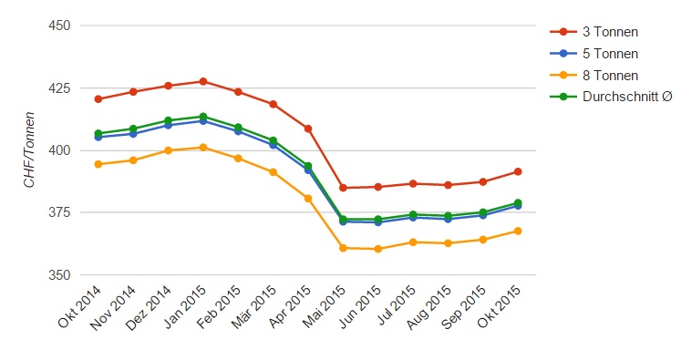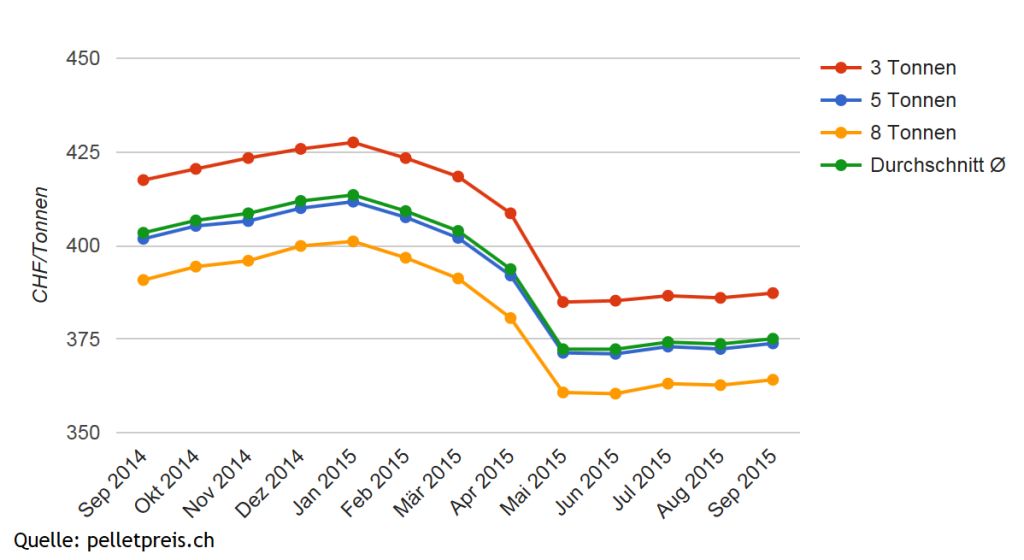 2016년 3월 스위스 wood pellet 가격 경향은 지난 1월부터 계속적으로 하락 경향을 보여 주고 있습니다. 2016년 2월 가격과 비교하면 0.4%로 약간 하락하여서 현재 가격은 CHF 385.2/tons (EURO 350.87/tons) 이었습니다.그리고 2015년 3월 가격인 CHF 403.9/tons 보다는 2.15% 감소하였습니다. 하지만 현재 통화의 등락때문으로 유로화를 기준으로 하면 2016년 3월 가격은 전년 대비 7.44% 하락하였습니다. 구매량을 기준으로 2016년 3월 가격은 3 tons 구매시에는 CHF 372.7/tons (EURO 363.45/tons)이고, 8tons 구매시에는 CHF 398.9/tons (EURO 340.15/tons) 입니다.