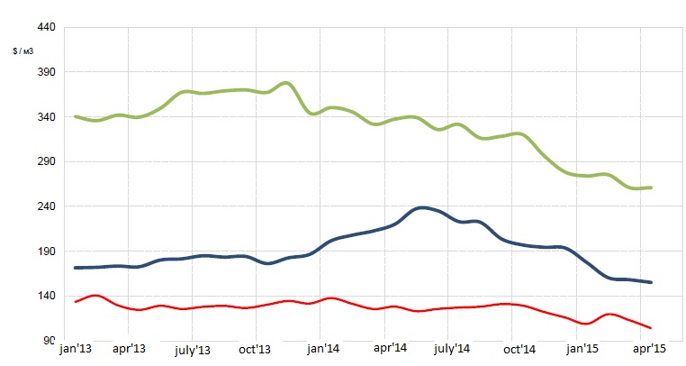 2015년 1월에서 4월까지 러시아 침엽수 제재목 가격은 전년 대비 23% 하락하여 약 $134/m3 (러시아 국경에서의 평균 가격) 이었고, 수출량은 전년 대비 4% 증가하여 7.3 million m3 이었습니다.