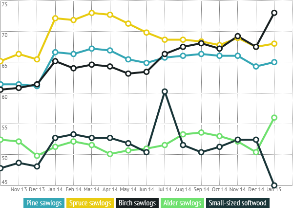 지난 7년간 pine 원목 구매 가격은 69-84% 상승하였고, 가장 큰 상승폭은 2009-2010년 그리고 2013-2014년에 기록하였습니다. 그러나 2014년 상반기부터 pine 원목 가격은 하락하기 시작하였습니다. 금융 위기로 라트비아 가격이 바닥을 기록한 2009년 상반기와 비교해 보면 2015년 하반기 직경 24cm 이상의 birch 원목 가격은 65% 혹은 EURO 40/m3 이상 상승하였고, 직경 18-24cm의 birch 원목 구매 가격은 34% 혹은 EURO 25/m3이 증가하였습니다.