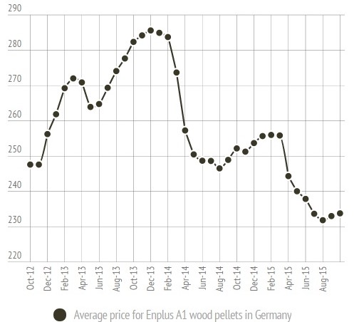 2015년 독일 wood pellets의 소매 가격은 안정적 이었습니다. 난방의 계절이 시작되면서 Enplus A1 Wood Pellets의 독일 평균 가격은 9월에 비하여 0.3% 상승하였지만 2014년 10월보다는 7% 낮아지면서 EURO 233.78/tons 입니다. Wood Pellets으로 생산하는 1 kilowatt-hour (kWh) 의 비용은 EURO 4.68 cents 이었습니다. 난방용 유가에 대한 wood pellets 가격적 이점은 12.5% 이고 천연 가스에 대한 가격적 이점은 거의 30% 입니다. 독일 에너지 wood와 pellet 연합 (DEPV) 회장인 Martin Bentele은 올해 나머지 기간동안에 독일에서의 wood pellets 수요가 증가하면서 가격이 계속적으로 상승할 것으로 예상하였습니다.