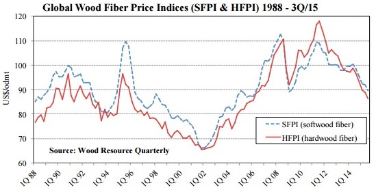 2015년에 전세계 제재 산업에서 우울한 소식이 종종 보고되었지만, 2015년 1월에서 9월까지 침엽수 제재목 거래는 전년 대비 증가하였습니다. 2008년 금융 붕괴로 제재목 시장이 붕괴된 이후로 북미에서의 제재목 생산은 증가 경향을 보여주고 있습니다. 2015년에 가장 큰 생산량 증가는 캐나다이었습니다. 미국에서의 제재목 가격은 3년 반동안 가장 낮은 9월이후 10월과 11월에는 회복되기 시작하였습니다. 핀란드와 스웨덴 제재목 수출량은 2014년과 비교하여 증가하였지만, 미국 달러 기준으로 수출 가격은 급격하게 하락하면서 Nordic 제재목 생산자들은 시장에서 더 많은 경쟁력을 가지게 되었습니다. 중국 제재목 수입가격은 2015년에 급격하게 하락하였는데 10월의 평균 수입 가격은 2014년 최고를 기록한 9월 가격보다 25% 하락하였습니다. 그리고 가장 큰 가격 하락은 유럽에서의 수입되는 제재목에서 기록되었습니다. 2015년 3사분기 러시아 침엽수 제재목 수출 가격은 2사분기보다 약간 하락하였고, 최고의 선적량을 기록하였습니다.Global Wood Fiber Price Indices