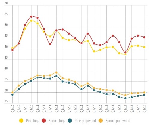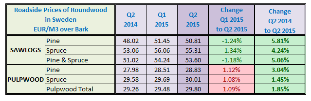 Roadside Prices of Roundwood in Sweden in Q2 2015